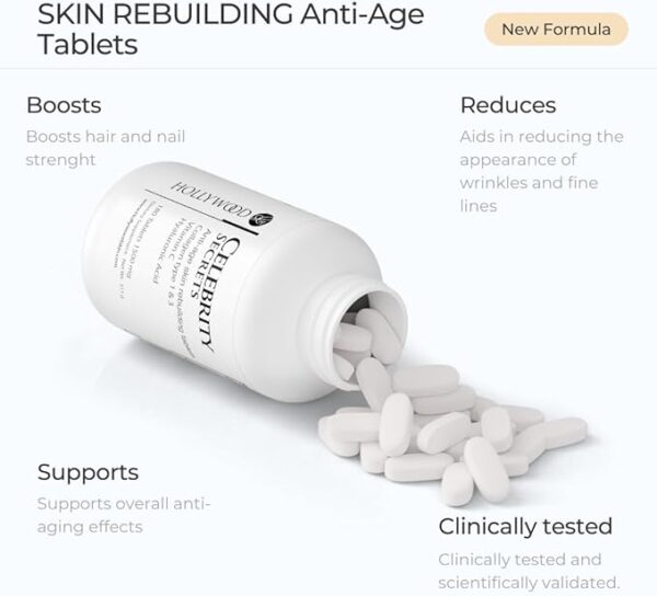 CELEBRITY SECRETS Anti-Age Skin Rebuilding Tablets – A revolutionary, science-backed cosmeceutical*. Developed through an intensive 19-month partnership with leading Swiss researchers, takes center stage. This patented blend of Hydrolyzed Peptides Peptan B 2000 LD is a true game-changer, promoting optimal skin health, joint support, and overall vitality like never before.